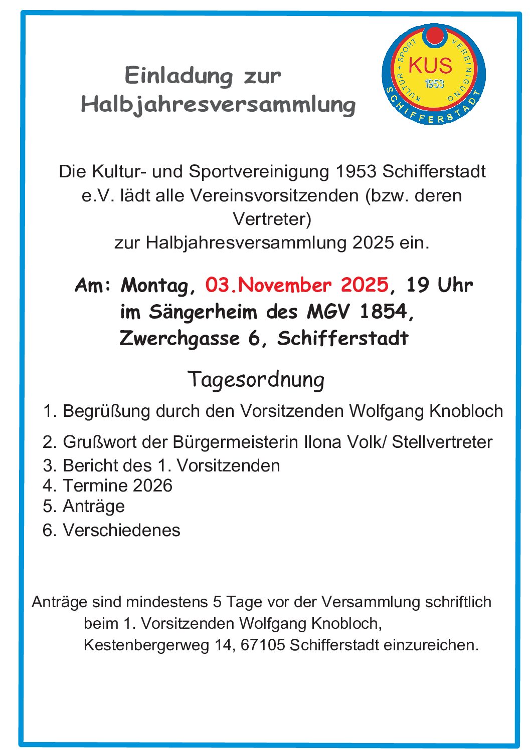 Die Kultur- und Sportvereinigung 1953 Schifferstadt e.V. lädt alle Vereinsvorsitzenden (bzw. deren Vertreter) zur Halbjahresversammlung 2025 ein.